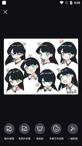 5、以“漫画脸”为例:导入照片后,在编辑页选择该功能,即可在日漫风、3D建模风、手绘水彩风、像素艺术风等风格中自由切换,实时预览并导出高清结果。