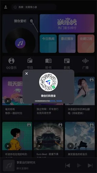 1、下载安装完成后即可运行打开使用,在主界面中即可看到提供了QQ音乐、科目、听书、新闻、广播等功能;