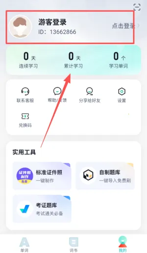4、在我的页面可以查看学习数据如连续天数与累计单词量,也能找到联系客服实用工具等功能随时获取帮助。