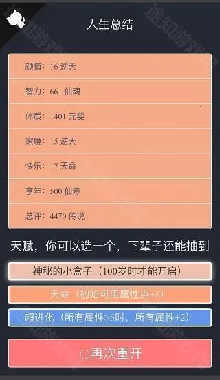 3、建议玩家们想要活到100岁选神秘的小盒子天赋,选了这个就主攻体质尽量活到100岁。要不然就主攻智力,去买乞丐的仙法,同时也不能丢掉体质。修仙的话千万不要选多重人格和克苏鲁。