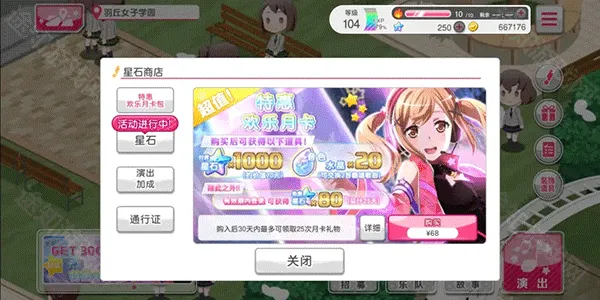 1、月卡(68元)购买后立即获得付费星石1000与音色水晶*20(可在用来购买歌曲),并可以在30天的有效期内领取最多25次免费星石80。共计获得付费星石1000,免费星石2000,月卡不可叠加购买,合计性价比(1:44.1)
